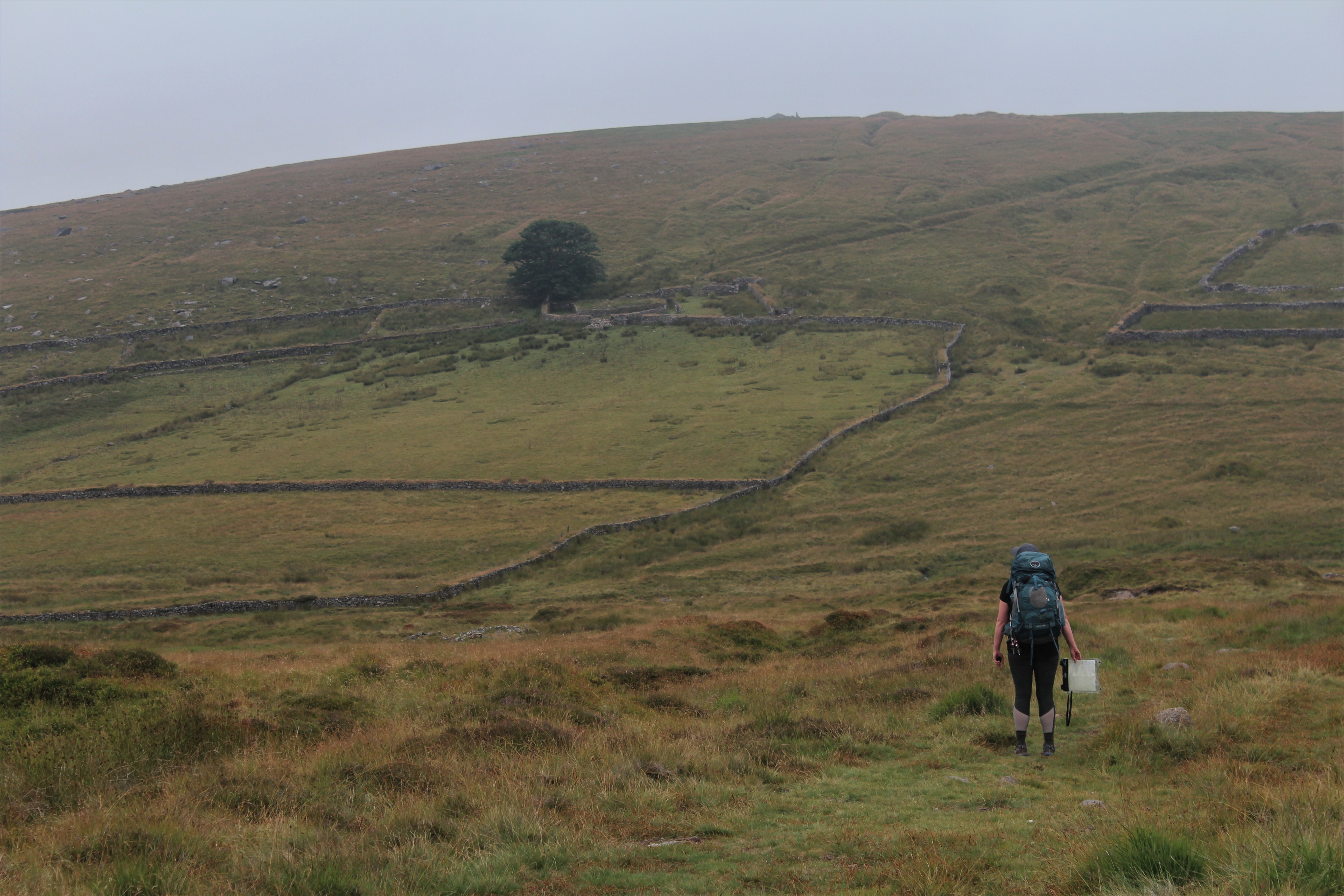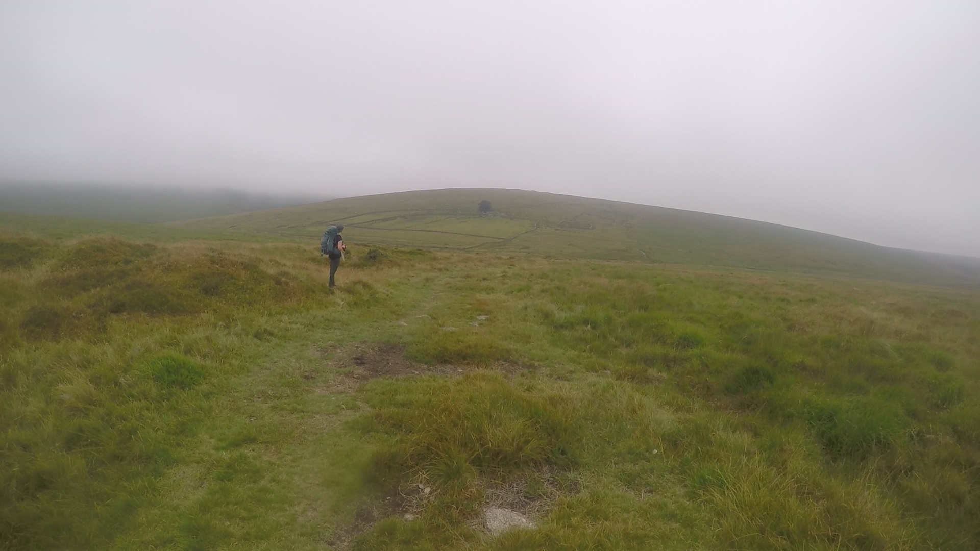 Astonishingly, we awoke to a misty and damp morning. The blistering sun of the previous day would not re-emerge until the afternoon. Climbing away steeply from our campsite, the path gradually cut through the mist to once again reveal bleak moorland. The spectral figure of a trail runner ghosted across our path as we climbed ever higher, past the rocky cairn of Pupers Hill, and towards a point on our map on Huntingdon Warren intriguingly named Heap of Sinners. What appeared to be the skeletal remains of two buildings, one large and one small sat on the slope, with a single lonely tree just above them. The top of the hill appeared to be crowned with heaps of rock and rubble. My knowledge of Dartmoor folklore was not good enough to offer an explanation to the name Heap of Sinners, but with the mist closing in ominously around us we quickly moved on.