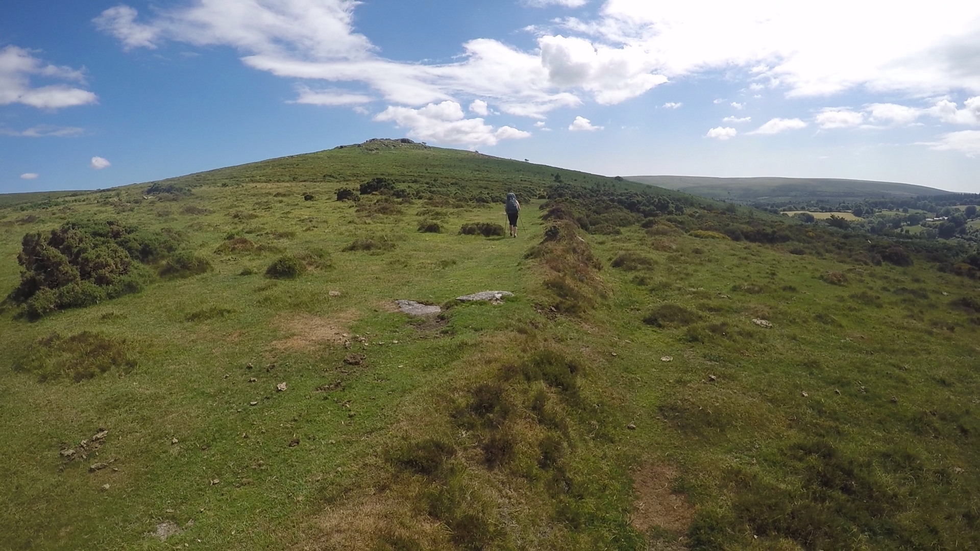 A gradual trundle down the hill led us to a dusty track, and we entered the wooded area named Soussons Down for some well-needed respite from the sun. Leaving the cover of the trees, Yar Tor was approached initially via a track crossing Cator Common, then a narrow lane taking us towards Middle Cator, a small collection of farmhouses and stables. We passed by two ponies whilst entering a small field, sympathising with them as they attempted to relax in the shade with swarms of flies hovering around them. We reached a small spring and again drank for what felt like half an hour, before climbing up through increasingly steep fields and on to the exposed shoulder of the hill. Factor 50 sunscreen was once again reapplied as the sun beat down on us with a vigour we had not experienced since our travels in New Zealand.