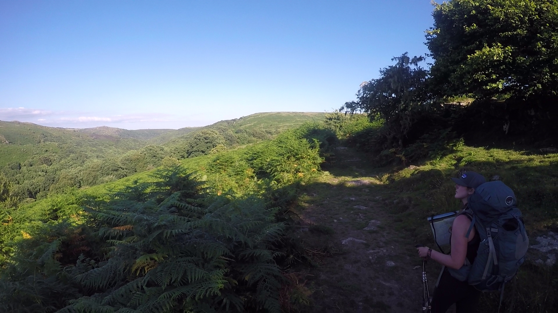 Passing down steep, shadowy lanes and through Holne, we were now officially on the route of the Two Moors as we reached Scurriton. A small pub provided us with a chance to have a drink, a bite to eat and to cool down. By the time we had finished the sun was setting, and we still had a short distance to cover before stopping for the night. Heading west out of the village, we would be camping on the edge of the moor at Chalk Ford. Rest was now at the forefront of my mind as darkness closed. Half an hour’s steady climb up a narrow lane led to a wooden bridge and a pleasantly flowing ford. A small clearing provided us with our camp for the night. Signs of previous night’s campers came in the form of a small bonfire in the centre of the clearing. Aided by our head torches the tent was erected and I fell instantaneously into a deep and well-earned sleep.