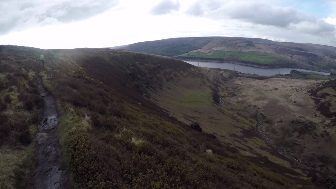 Lunch was taken and after reaching the top of Black Hill. Ignoring a path cutting off to the west, we noticed a marked change in the landscape. We were nearing the end of the Peak District and the narrow gorges and dramatic hills where gradually transitioning to the wider expanse of the South Pennines. The mark of mankind was also noticeable here, with small settlements and a distant transmitting station off to our right and a road charging through the rugged landscape to our left. Despite the sunshine, a chill wind re-emerged and we hurried down the hill. After about half an hours descent and a brief dip down into Dean Clough, we were making our way towards Wessenden Reservoir. It was a beautiful landscape with families and dog walkers enjoying the fine weather.