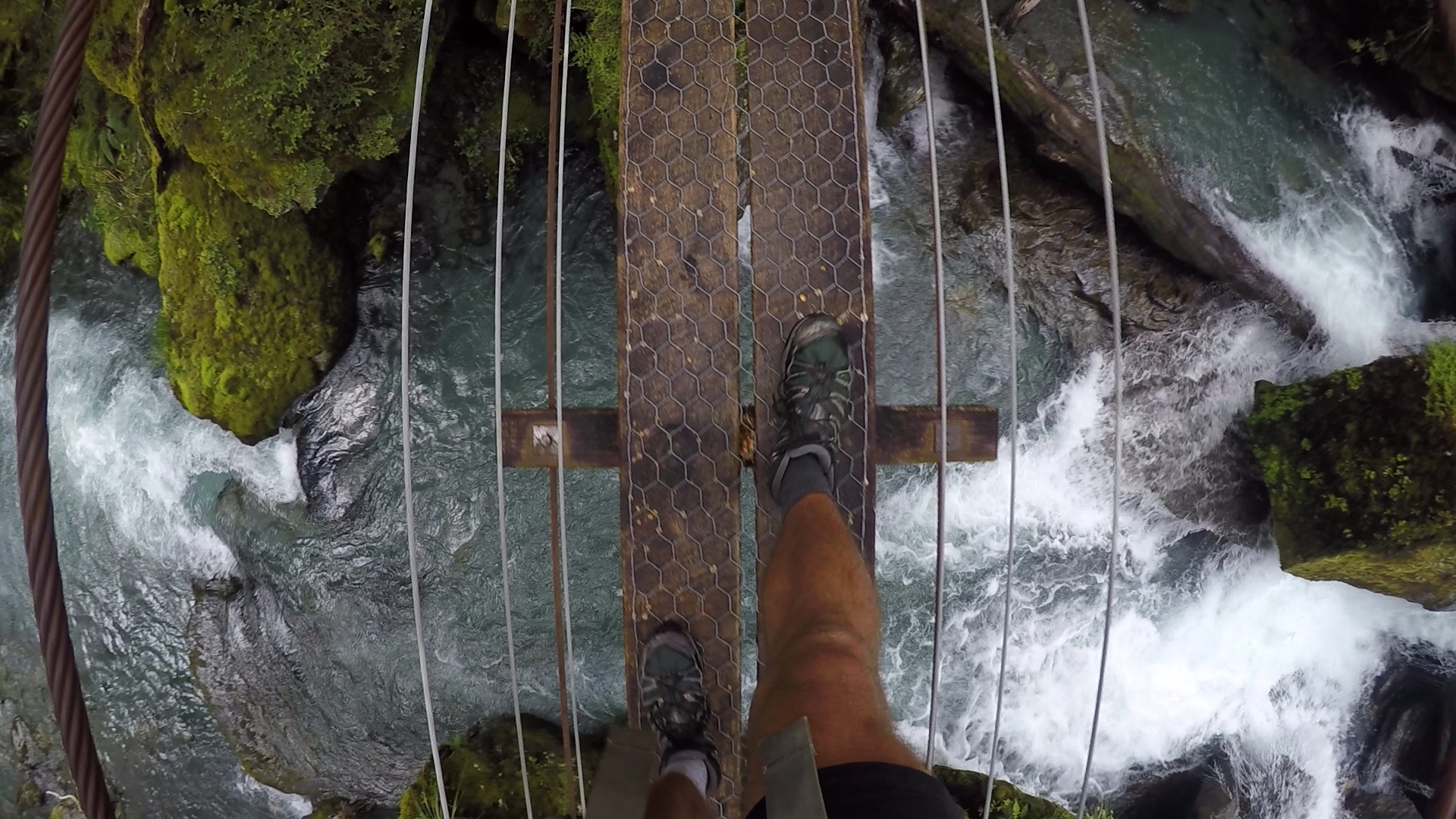 At the junction of the north and south branches of the river, we reached a swing bridge. A basic campsite was nearby, but we pushed on, eager to reach the shelter of Young Hut. We followed the southern branch of the river. The track, narrowing again, took us back up into the undergrowth. Our unpredictable path looked down upon the thundering river, and we encountered our first major obstacle. We had been walking in a single file for most of the day, but our route now required us to edge along sideways as the unstable path began to give way beneath our feet. One slip would see us plummet down a steep bank and into the deafening torrent of water twenty metres below us. Aware of the weight on our backs, we knew any slip could prove to be fatal. Our route looked impossible to pass. Now, the level track could have been no more than thirty centimetres in width. We could see that within fifty paces or so the path would broaden out again. We considered alternatives. Do we battle upwards through the thick forest in an attempt to find another route? Impossible, the denseness of the undergrowth was unpassable. Should we slide down the bank as carefully as possible, and use the boulders emerging from the water as stepping stones? Again impossible. There would be no way to control our momentum down the steep bank. We would have to edge along the path.