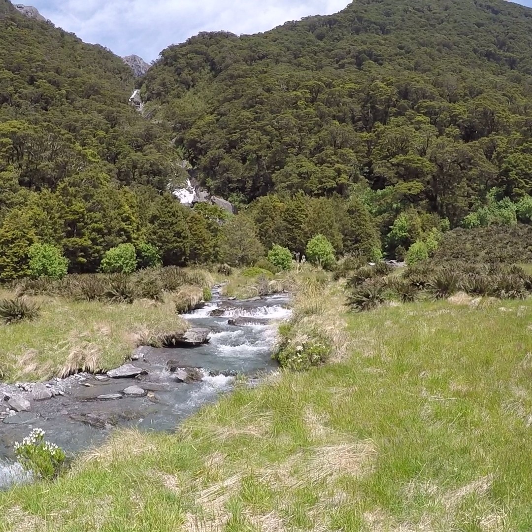 Down we went, passing blasted rock and shingle. It was a harsh environment, and our imaginations were able to run wild as we relaxed once again into the rhythm of walking. The ascent had taken its toll on Lisa, her stiff boots straining her achilles and testing her previously injured ankle. Due to this our meandering route down the mountain, towards the bushline was slow. The track reached the forest, and this shelter proved to be a relief from the heat of the day. We had not felt it whilst up on the pass, being distracted by the task at hand. Our route gently wound downwards, ambling alongside Gillespie Stream, which soon flowed into the larger Siberia Stream. A series of zig-zags brought us to the valley floor. The late afternoon sun was dazzling. Once again the valley was partly flooded, which slowed our progress.