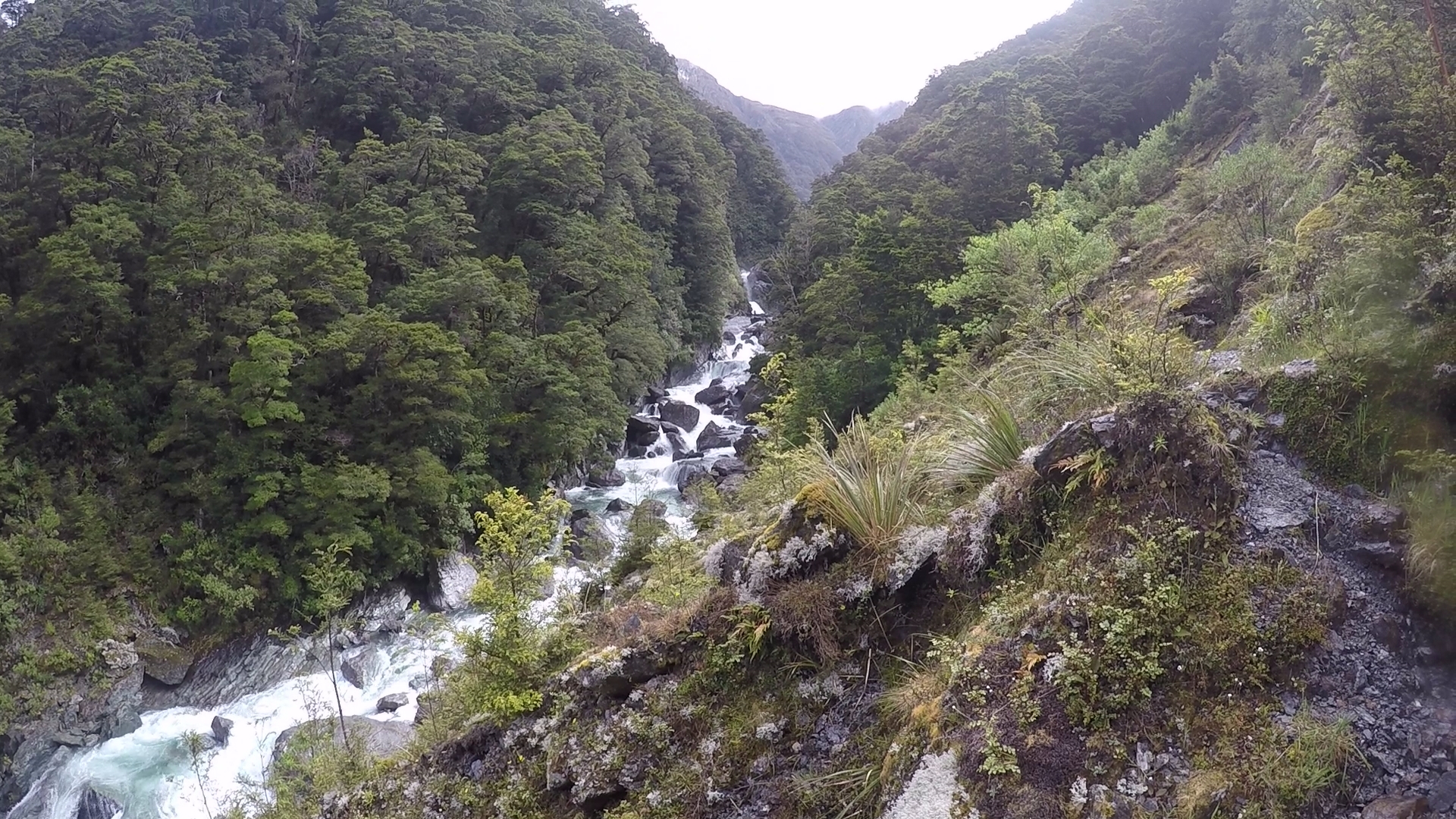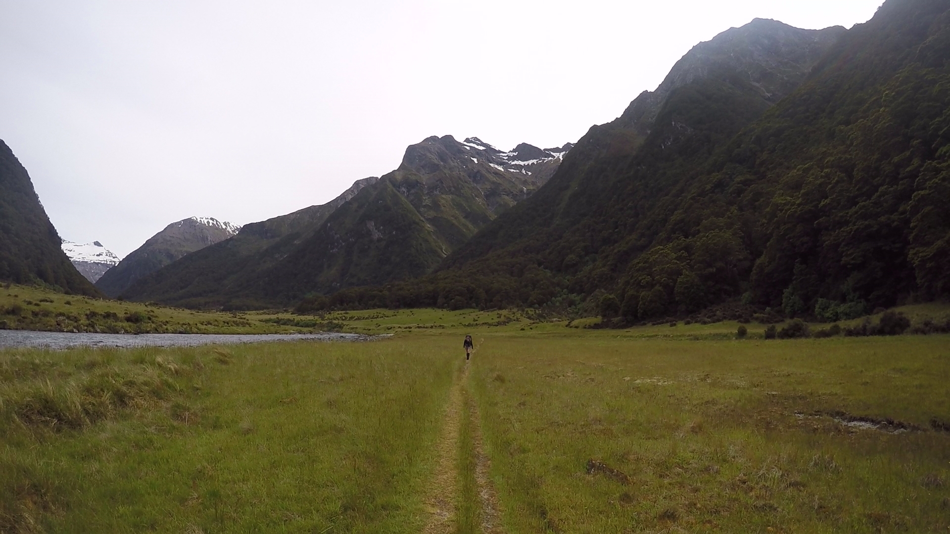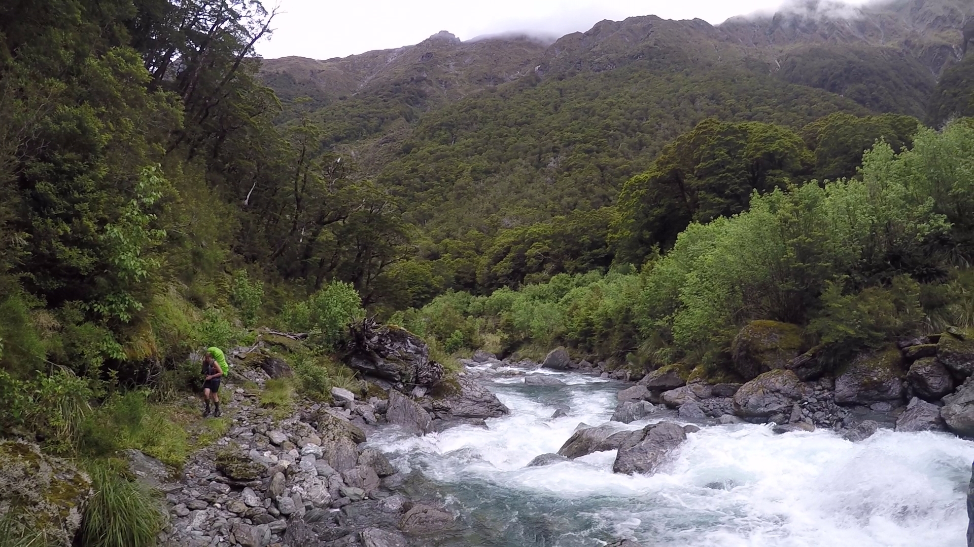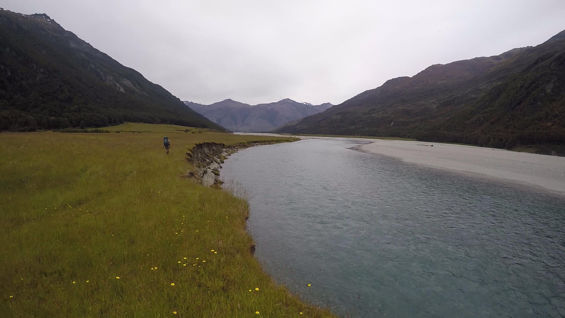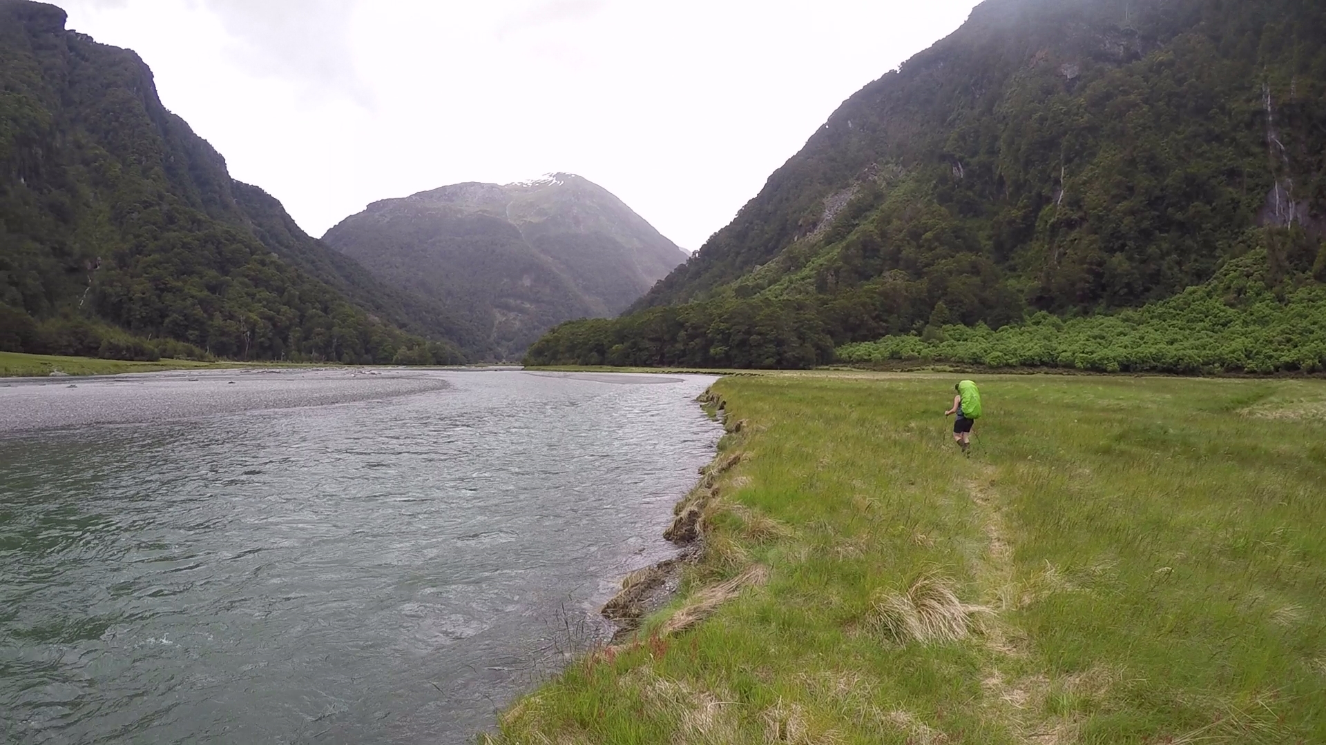 Further and further we travelled, observing the rushing river from our precarious vantage point. Gnarled and slippery tree routes snaked across the path, slowing our progress. At least two hours passed before the route began to gradually descend. We reached the level ground of the river valley, our route now crawling through a wide expanse between high peaks to our right and the deep, wide flow of the Young river to our left. With light rain beginning to fall we quickened our pace. The ground of the river plain was saturated, indicating the river had flooded recently.