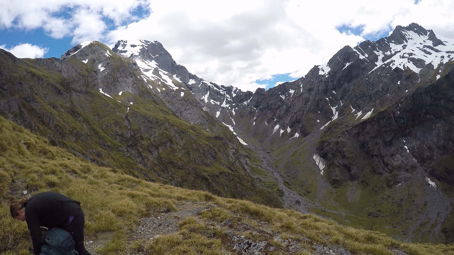 Knowing what we had to do, we got on with it. Heads down and pushing on and on, occasionally allowing ourselves a look at our surroundings. At times our route became a more traditional steep path, and I was thankful for it. Mt Dreadful now came fully into view, its dark ridge and threatening peak greeting us as we reached the saddle of the pass. The highest point of the pass was 1600 metres, but it felt higher as we surveyed our stark and ominous surroundings. Huge slabs of ice and snow were gripping to the side of the mountains, and we suspected we would encounter some soon ourselves. When we did, we had to take a moment to compose ourselves. In the distance was the comforting sight of an orange post. Blocking our way was thick snow, covering a slope that gradually fell away to our right, before plunging to an unseen precipice. I immediately slipped as I stepped onto the snowy sheet, and struggled to bring myself to my feet. Lisa, wearing heavier leather boots and armed with hiking poles, bravely went ahead, slowly but methodically treading a path for me to follow. The further we went the less threatening the slope became. We began to gradually descend, and saw ahead of is the unmistakable sign of slide marks, down the slope towards the rocky path. Someone had been here before. Following suit, we slid down on our bottoms, a welcome relief from the earlier tension. Laughing to ourselves, we believed the hardest of the route to be over.