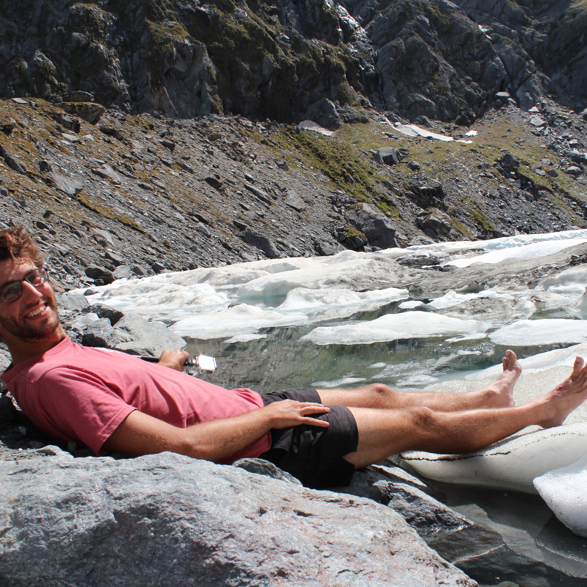 The approach to the lake was rocky and slow, and we covered a short distance in what felt an unduly long time. Finally, we reached the lake, slumped down and surveyed the scene. The lake sat at the foot of Mount Alba, and its dark, steep slopes formed an amphitheatre around the circular lake. Huge icebergs remained in the lake, despite the hot weather beating down upon them. After a brief rest, we shuffled down the shingle bank to get closer to the water. Daring to test the temperature, we removed our boots and socks and dipped our feet into the icy water. Feeling refreshed, we ate a small lunch while admiring our surroundings.