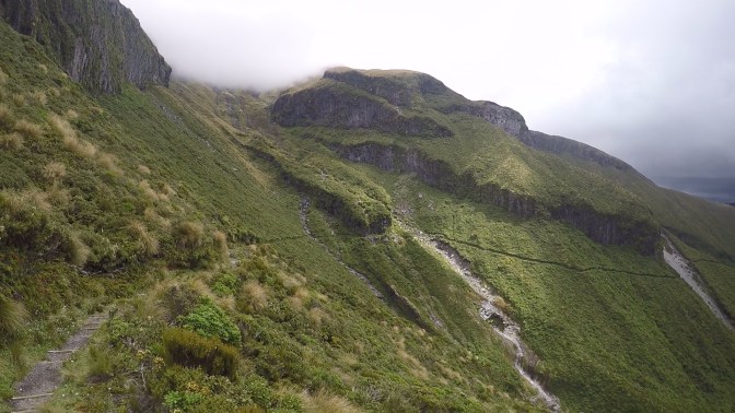 We would be hiking in this region for three days. Before summiting Taranaki, we planned to explore the slopes of the mountain and trek the mysterious Pouakai range to the north-west. This day would be short, but steep. We began by climbing a narrow path up one of Taranaki’s mighty wooded shoulders. The weather shifted quickly, and within an hour warm layers had been deployed, though I stubbornly remained in shorts. The path slid around the torso of the mountain, cut into the delicate and volatile slopes with scalpel-like precision. Navigating our way around the mountain was trickier than the initial ascent. A crumbly, narrow path required us to walk in single file.