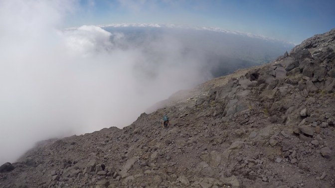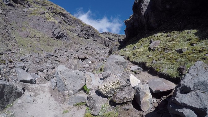 The ascent had been strenuous, and now the route took us through the boulder-strewn Hongi Valley. Orange poles, roughly five-foot-high kept us on course. With the sun beating down, we frequently stopped to rehydrate. The most difficult stage was yet to come. For two hours, we batted up a steep scree slope. Without a solid footing to push off from, progress felt slow. Cloud enveloped us; visibility was significantly reduced. Then finally, rock. The scree had been navigated, and the cloud began to disperse. I did not allow myself to stop for too long, wanting to keep momentum and enjoy the views from the summit.