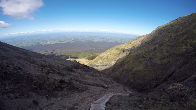 Our descent was significantly shorter than the ascent. At the precarious scree slope, I noticed hikers effectively skiing down at great speed. By digging their heels into the scree, pushing down, and using their thighs as brakes, this awkward section was navigated at great speed. I tried this too, and the rips in the backside of my trousers attest to the low quality of my skiing. But it did not matter. As the sun began to set, the peaks of the Tongariro Crossing came into view. This was the next destination on our hiking marathon.
