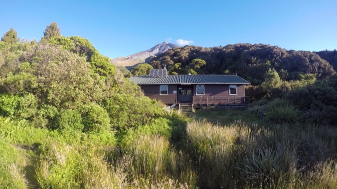 Late in the afternoon, we reached Holly Hut. It was one of the most inviting alpine shelters I had ever seen. Resting in a peaceful clearing, the peak of the mountain was still visible behind the hut. The sound of a stream and birdsong added to the idyllic setting. There was a chill in the air, and a fire had been lit in the hut’s furnace. We greeted the hikers inside, dropped our bags by a bed and headed back out. With the evening drawing in, we walked back up the hill for one last look at the mountain. The cloud was starting to clear, and Taranaki was bathed in golden light. It was nearly dark before I was able to tear myself away.