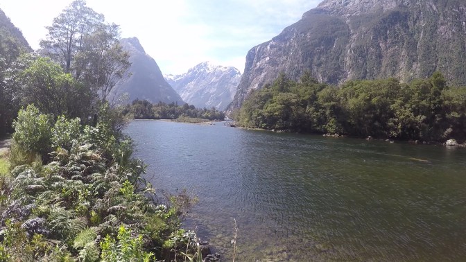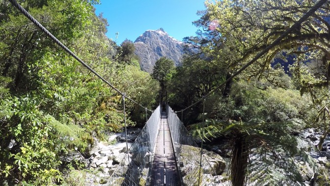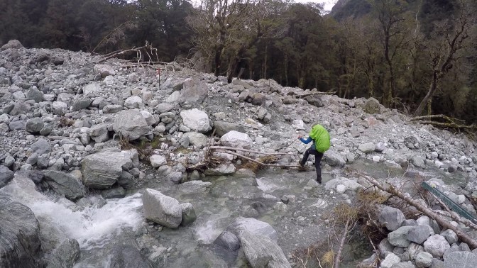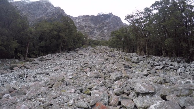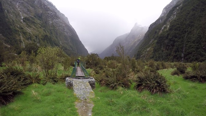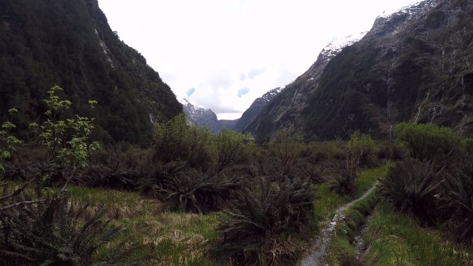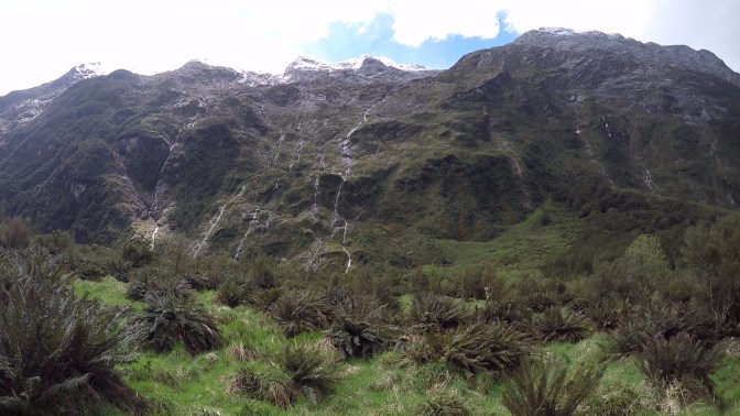 We made it to the head of the valley, and as we climbed higher into the undergrowth, a towering granite wall of rock was visible ahead of us. This would be tackled tomorrow, after a climb over the notorious Mackinnon Pass. After passing a private lodge, we reached what appeared to be a sheltered bus stop. This crude metal structure was located just before a torrent of water, tumbling from the peaks and down towards the Clinton River. Fortunately, the day’s rainfall had not been hard enough to render it impassable. With some difficulty, and at times walking through ice-cold water up to our knees, we reached the other side.