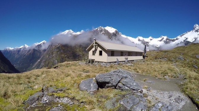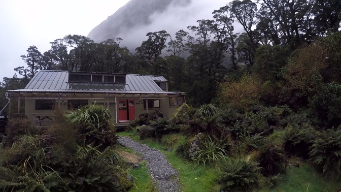 Eventually, the gravel path led us out of the undergrowth, and towards the narrow head of the valley. Here the rock flanking us was sheer, with waterfalls cascading down from unimaginable heights. The ground began to rise the further we progressed up the valley. We would occasionally glimpse a walker ahead of us, but we felt largely alone. Gathering cloud behind us had begun to play on our minds. The speed at which the clouds massed together took us by surprise, and within minutes the temperature dropped appreciably. Pausing to add a warm layer, we turned to see the dark clouds rolling down the valley towards us. A storm was coming. I felt like Indiana Jones being pursued by a boulder, and reaching the shelter of Mintaro Hut at a faster pace was necessary if we were to avoid a soaking.