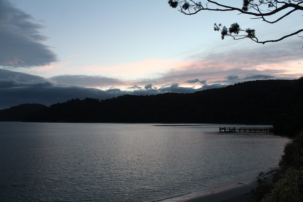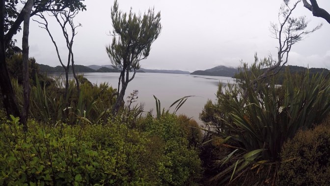 The trees above us began to sway wildly as a storm swept in over Sawdust Bay. The twisted rimu and kamahi trees to our left were distorted and weather-beaten, and rain pelted the side of our hoods like machine-gun fire. On a clear day, the views over Paterson Inlet would have been stunning. An abandoned wharf was passed and the track once again turned back into the forest, providing respite from the wind. Leading the way, I overtook a mother and son, who cheerfully greeted us despite the weather. They were the only hikers we saw all day.
