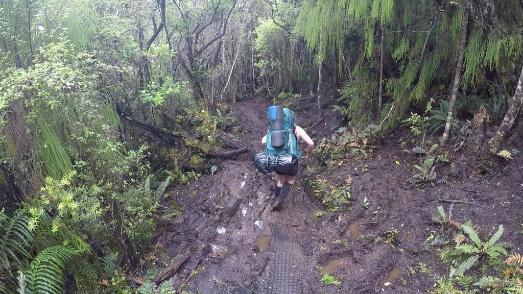 Unbelievably, the other hikers had seen a Kiwi during the night. They had been strolling back towards the hut when the bird had walked across their path and into the bush. Bemoaning our luck, we left the hut feeling we may have missed our chance. The previous day had been a sun-baked stroll along the coast. Now, we would be entering the dark interior of this mysterious island. The storm during the night had not been as powerful as feared. However, it had rained enough to ensure we would spend many hours battling up muddy slopes and scrambling down slippery hills.